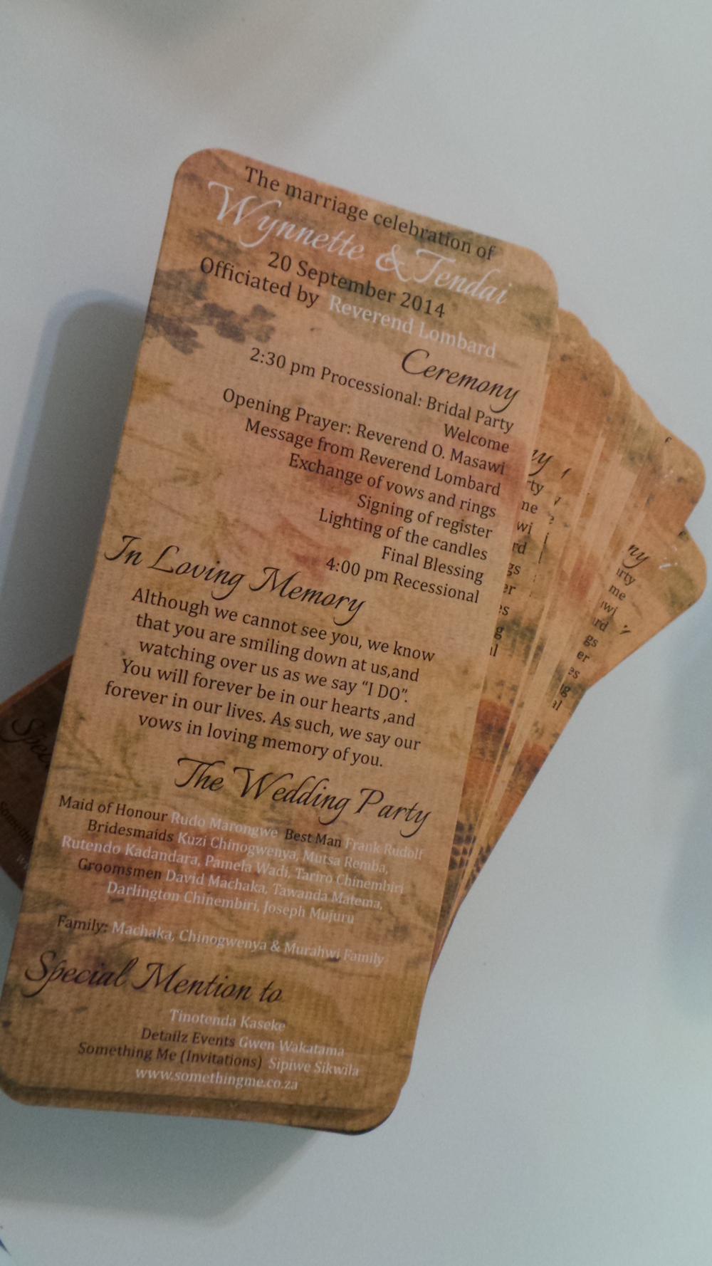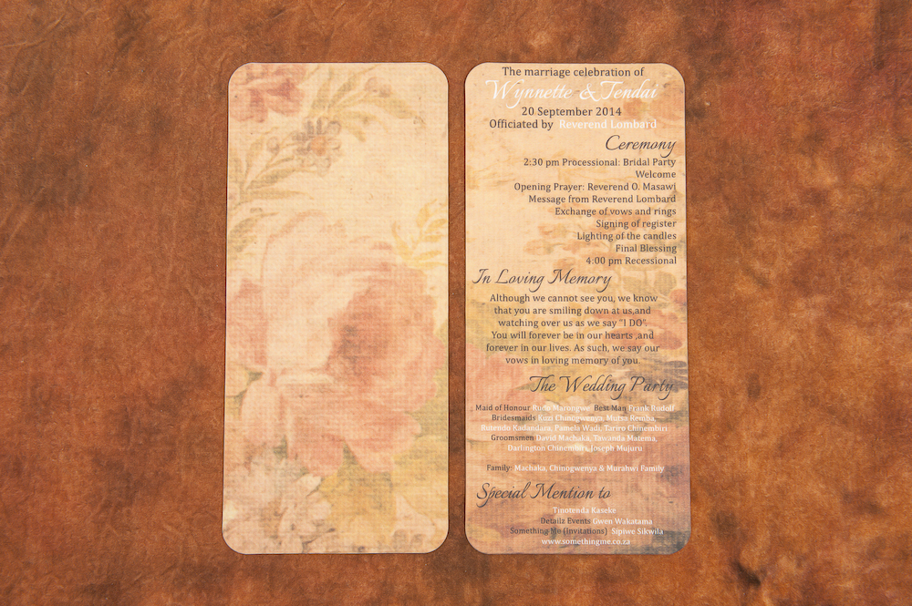 Ceremony Programme ← Previous Next → SEARCH OUR SITE Search for: BLOG UPDATES LETS GET SOCIAL LATEST BLOG POSTS HELLO SPAINTRAVEL PHOTOGRAPHY September 7, 2017 THANKFUL & GRATEFUL August 24, 2017 10 PLANNING TIPSFOR A SUCCESSFUL OUTDOOR WEDDING August 10, 2017 SOME TOP TIPS:INVITATIONS & STATIONERY July 27, 2017 WINTER DELIGHTSOVEN BAKED OXTAIL June 14, 2017 BLOG CATEGORIESBLOG CATEGORIES Select Category Charity Events (1) Corporate Social Investment (2) DIY Favour & Gift Ideas (1) Inspiration Boards (4) Invitations & Stationery (1) Lifestyle & Travel (3) People Spotlight (1) Real Weddings (2) Recipes, Food & Dining (1) Something Me Bride & Groom (1) Styled Events (4) Tips & Advice (3) RECOMMENDED SUPPLIERSRECOMMENDED SUPPLIERS Select Category Jewellers (1) Photography (2) ARCHIVE ARCHIVE Select Month September 2017 (1) August 2017 (2) July 2017 (1) June 2017 (2) May 2017 (2) April 2017 (2) September 2016 (2) March 2016 (1) February 2016 (1) January 2016 (2) December 2015 (3) November 2015 (3) October 2015 (2) LATEST SLIDESHOW